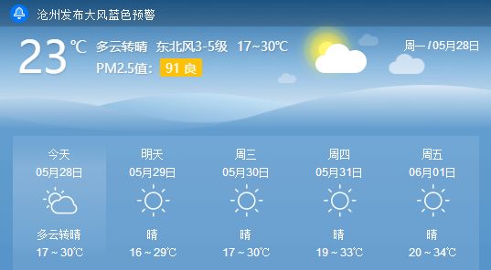 天气情况:今天,我市的天气情况为多云转晴,东北风3~5级,17~30摄氏度,空气质量,良,适宜外出及开窗通风。