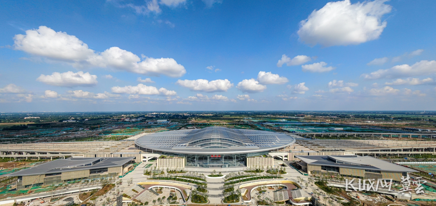 从空中俯瞰,京雄城际铁路雄安站巨大的椭圆形屋顶形似荷叶上的一滴露珠。任双欢 摄