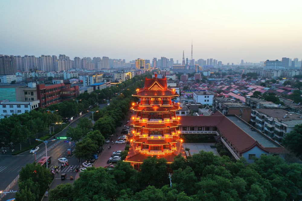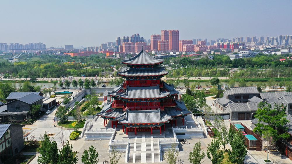 ↑沧州市京杭大运河畔的清风楼(5月15日摄,无人机照片)。