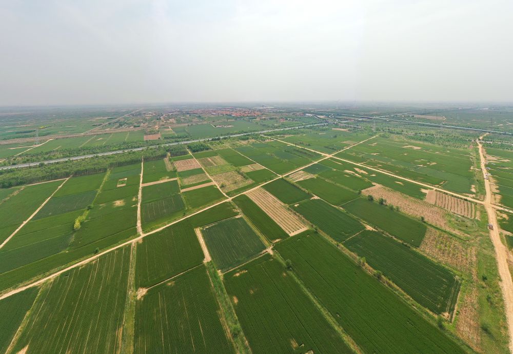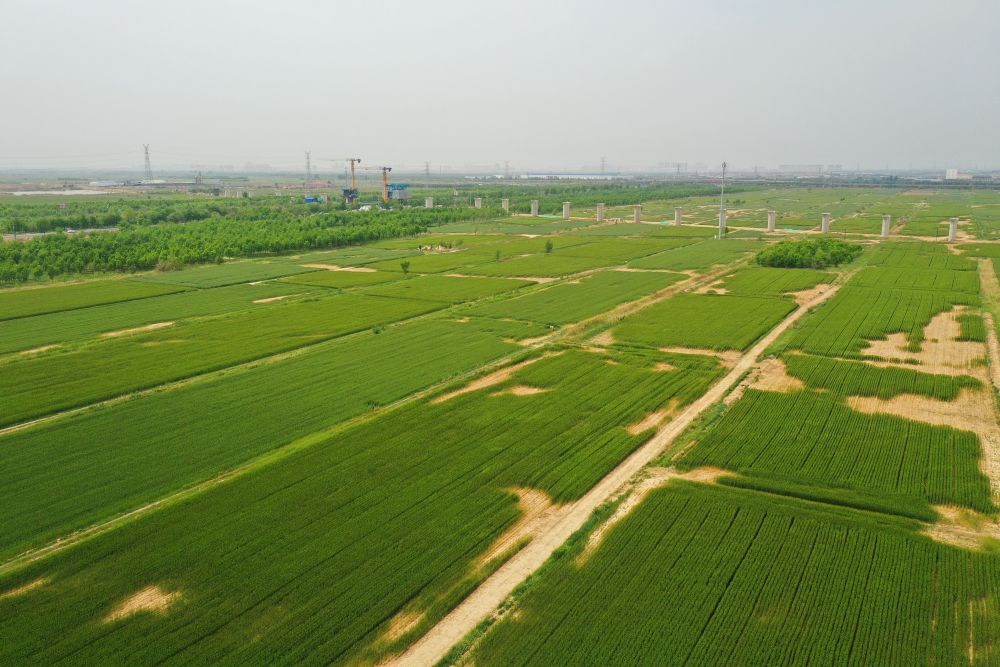 ↑沧州渤海新区黄骅市旧城镇仙庄片区旱碱地麦田(5月11日摄,无人机照片)。