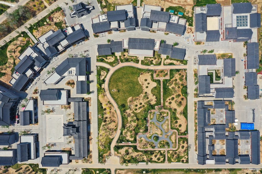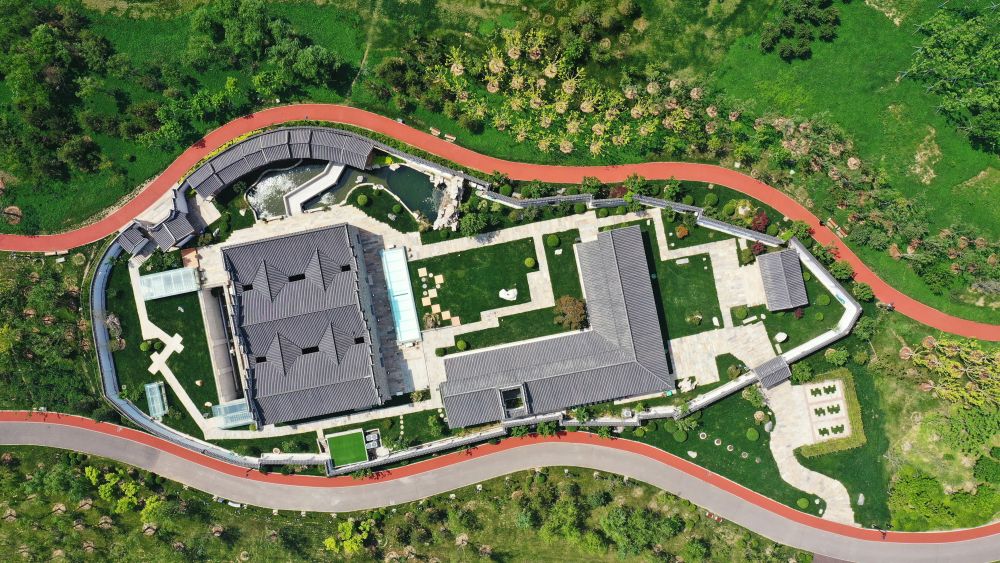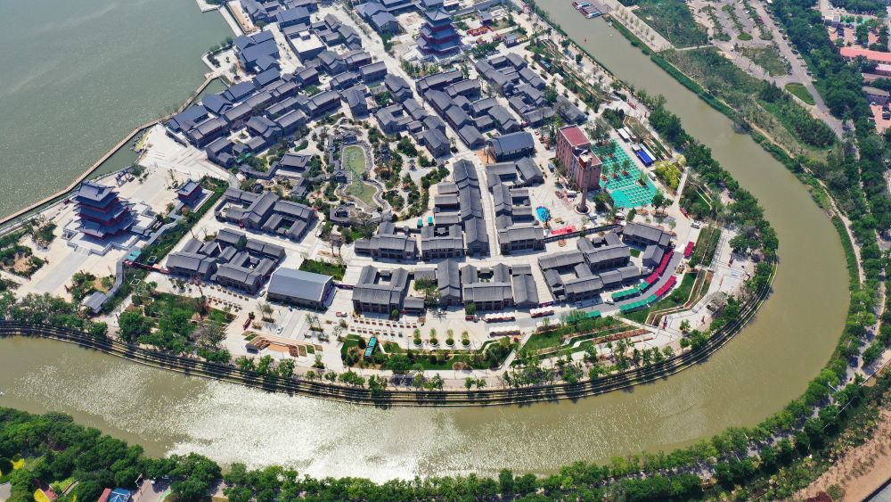 ↑沧州市京杭大运河畔的沧曲书舍(5月16日摄,无人机照片)。