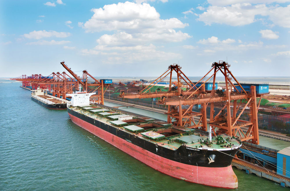 ↑货轮停靠在沧州黄骅港综合港区(2021年8月25日摄,无人机照片)。