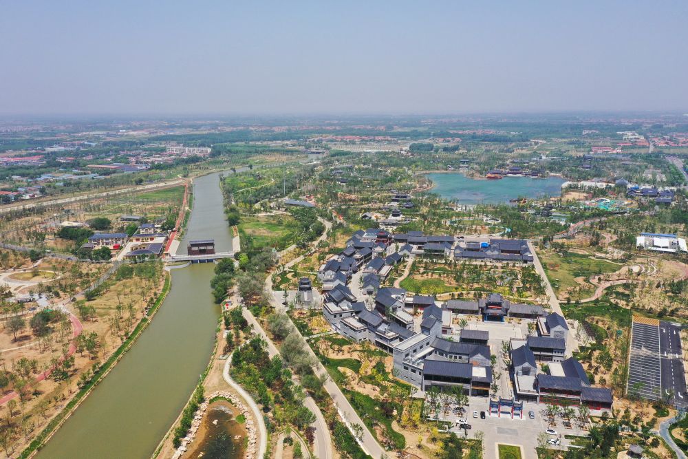 ↑沧州大运河生态修复展示区(5月16日摄,无人机照片)。